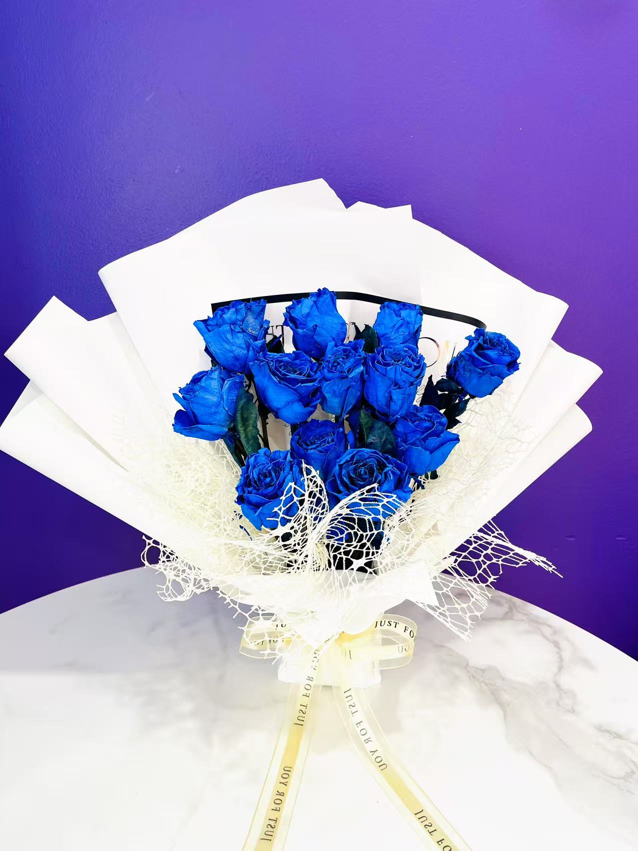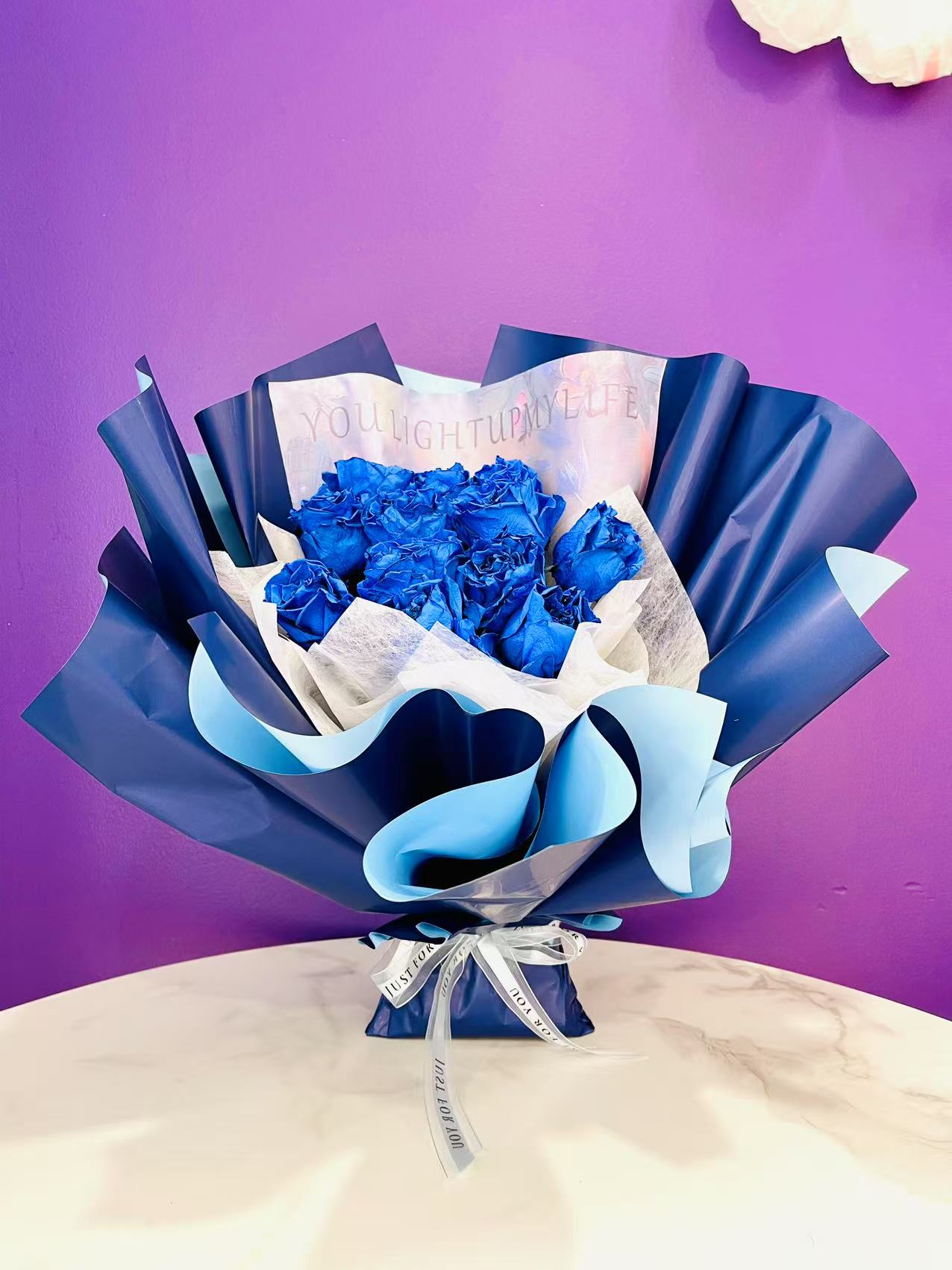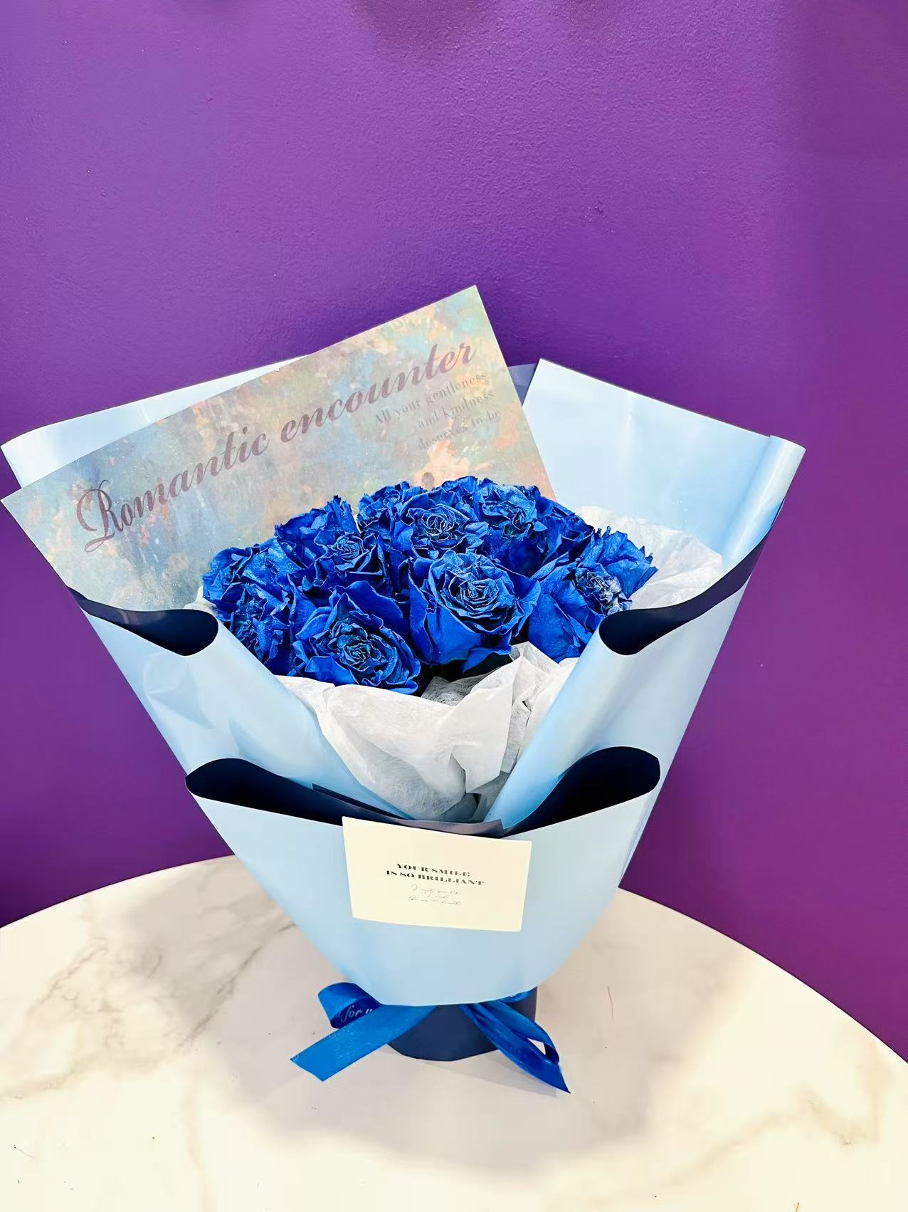 蓝玫瑰干花花束Blue rose dried flower bouquet in blue packaging
