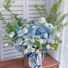 【高级抱抱桶】开业招财蓝色系混搭秀球玫瑰花抱【Premium Hug Basket】 – Grand Opening Fortune Blue Hydrangea & Mixed Roses Hug Basket