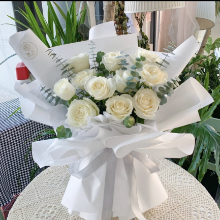 F058【纯粹的爱】11朵白玫瑰搭配尤加利鲜花束【Pure Love】 – 11 White Roses & Eucalyptus Bouquet