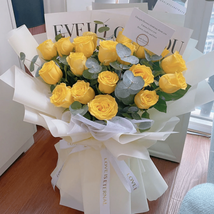 F032【真诚 】19朵黄玫瑰搭尤加利鲜花束【Sincerity]】– 19 Yellow Roses with Eucalyptus Flower Bouquet