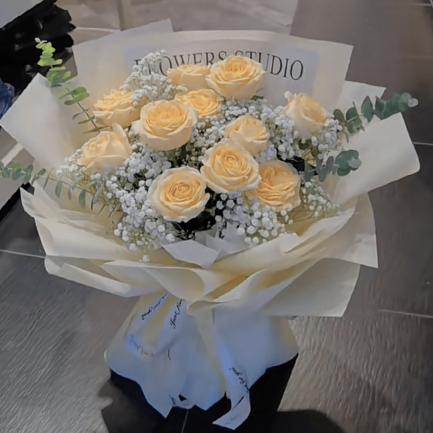 F033【只钟情于你】11朵香槟玫瑰搭尤加利满天星鲜花束【Only Your】 – 11 Champagne Roses with Eucalyptus and Baby’s Breath Flower Bouquet