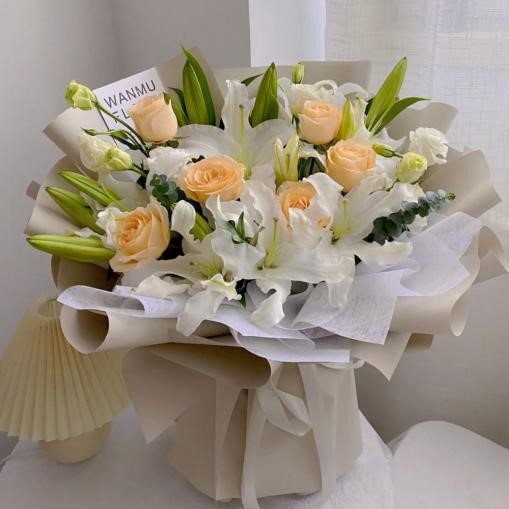 F037【一生守护】5枝白百合搭配6朵香槟玫瑰桔梗花束【A Lifetime of Protection】 – 5 White Lilies, 6 Champagne Roses, and Bellflower Bouquet