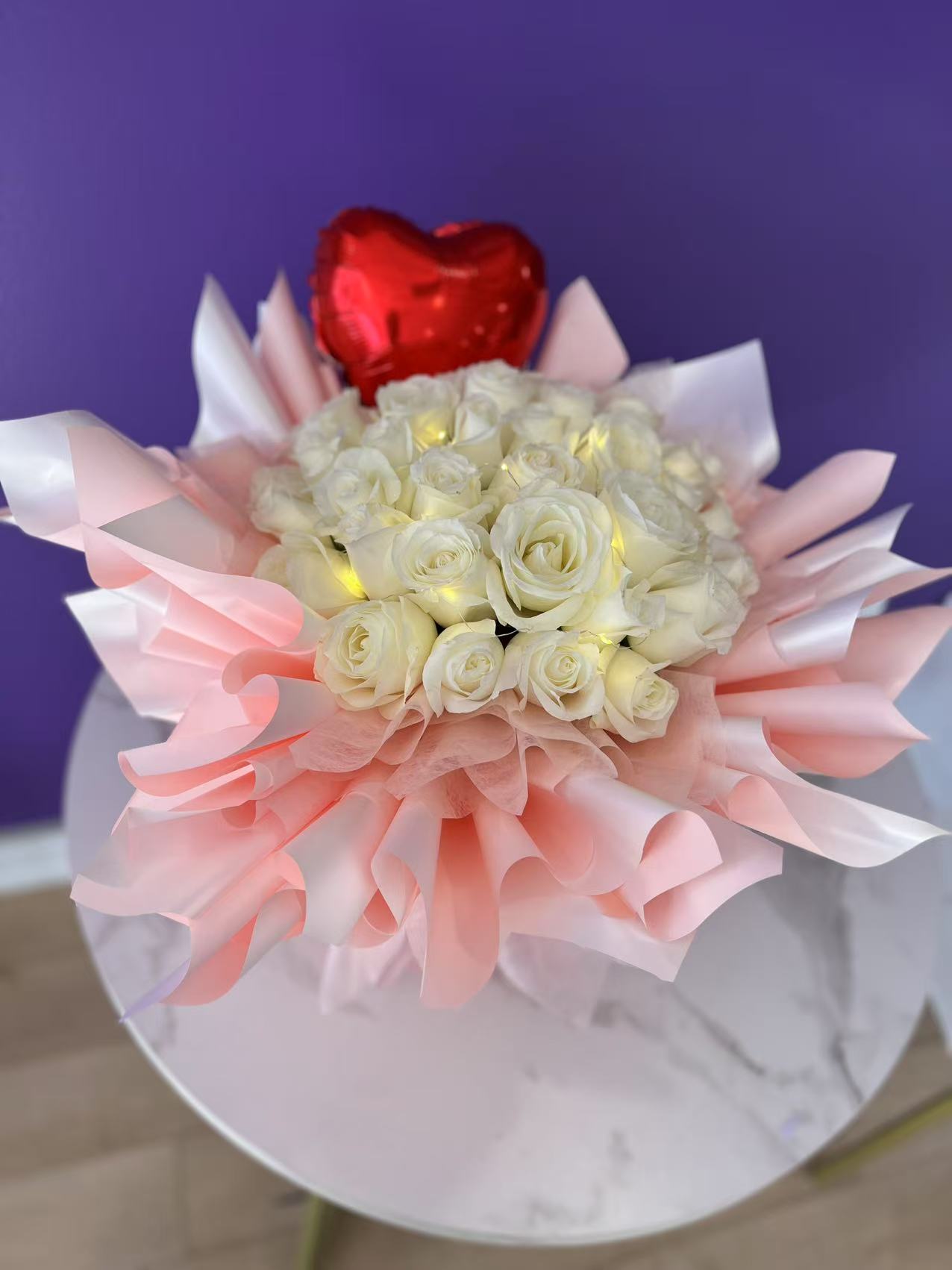 F091 33朵白玫瑰尖角花束加爱心气球33 white roses pointed bouquet with love balloons