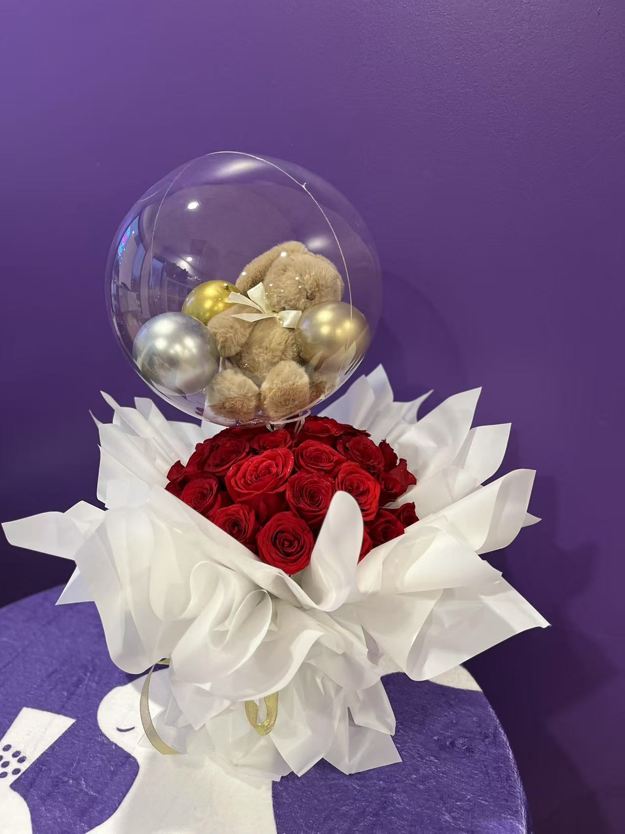 F090 33朵玫瑰尖角花束加波波球兔子娃娃33 Roses Pointed Bouquet with Bobo Ball Bunny Doll