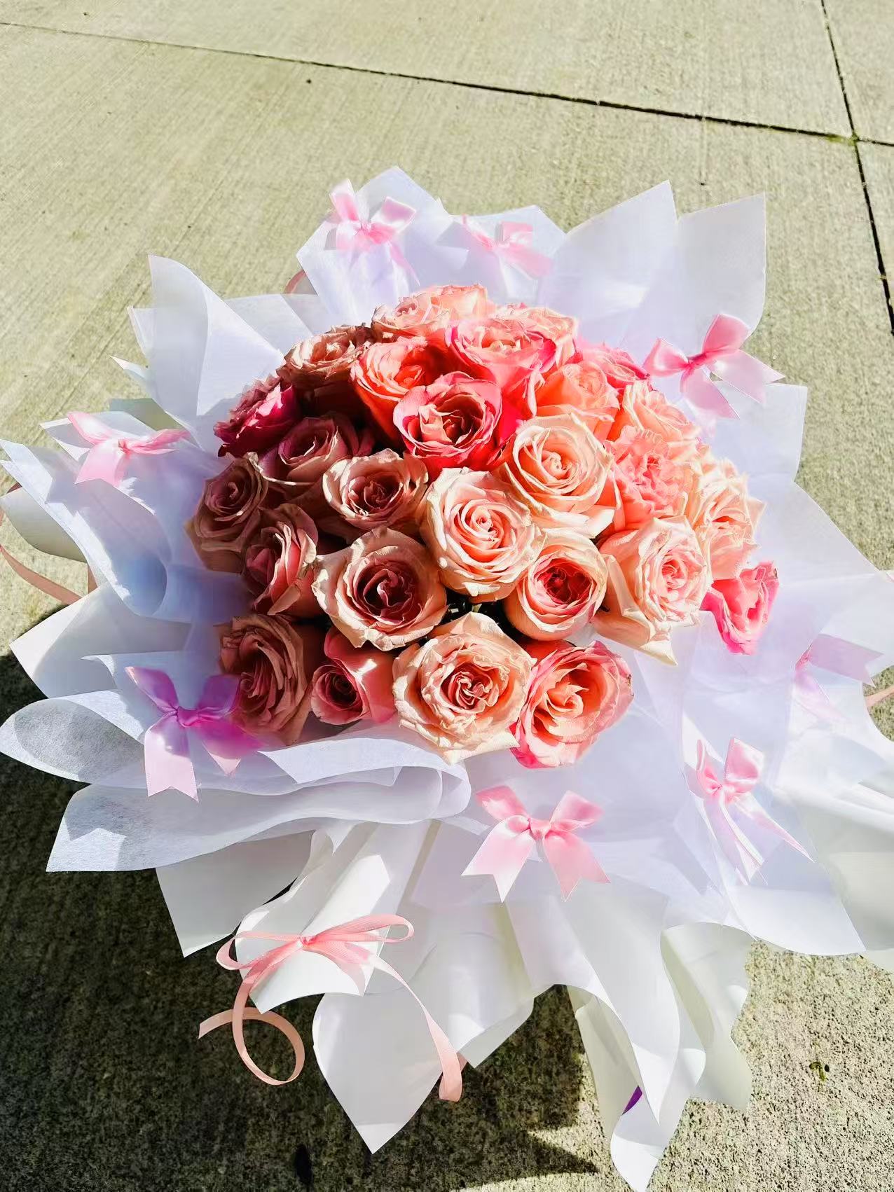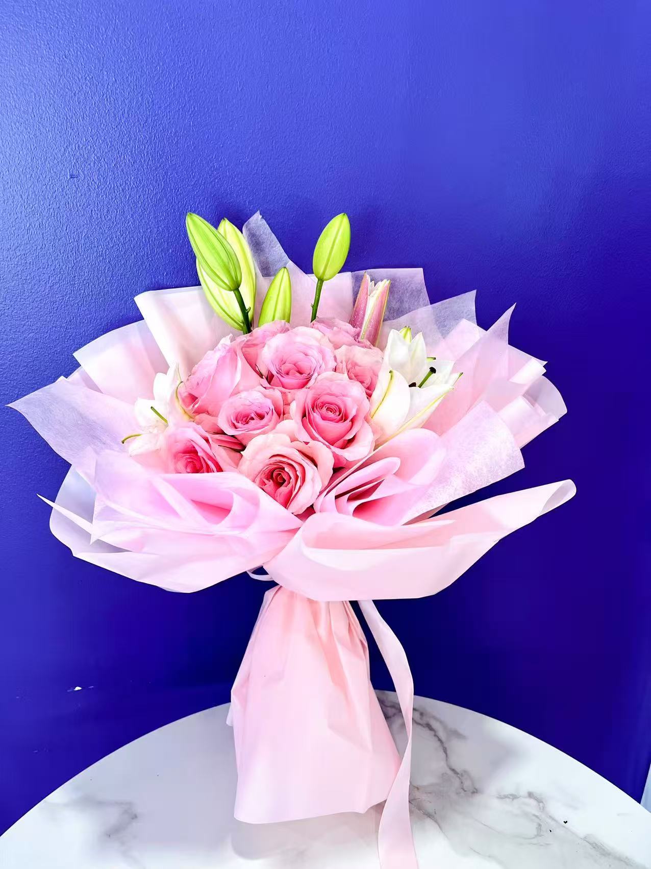 F082 粉玫瑰加百合花束Pink roses and lilies bouquet