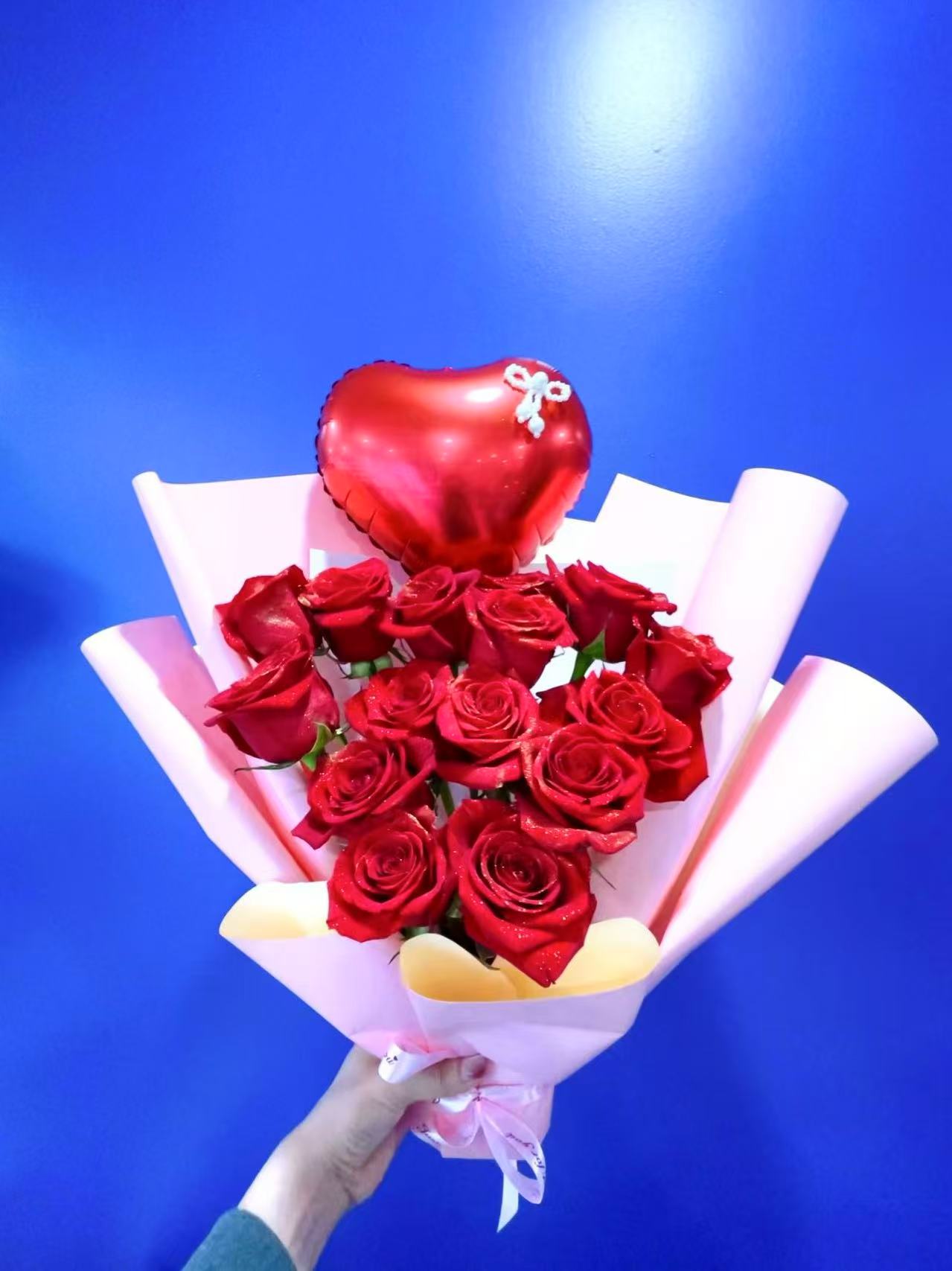 F085 14朵红玫瑰花束加爱心气球14 red roses bouquet with love balloons