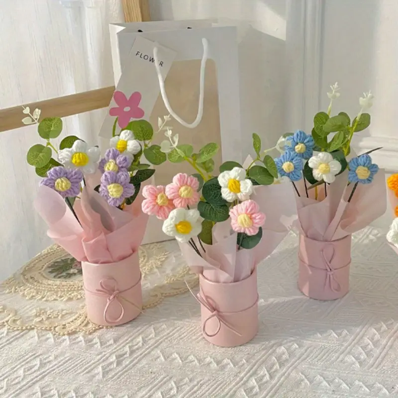 Charming Faux Flower Bouquet in Pastel Knitted Bubble Bucket