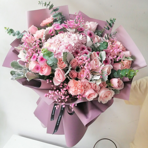 F068【为你倾心】-21枝粉玫瑰1枝粉绣球韩式鲜花花束【Heartfelt for You】 – 21 Pink Roses & 1 Pink Hydrangea Korean Style Bouquet