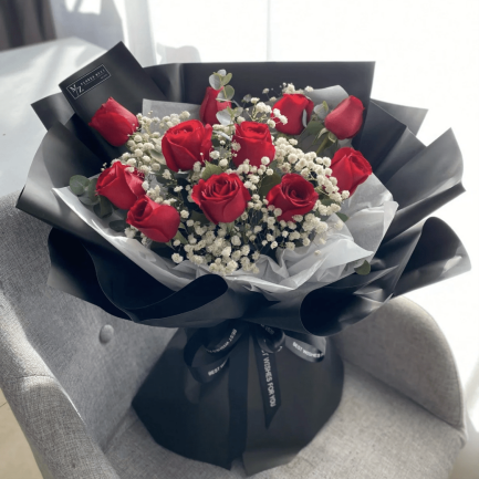 F011【一心一意】11朵红玫瑰搭配白色满天星鲜花花束【One Heart, One Mind】– 11 Red Roses with White Baby’s Breath Bouquet**