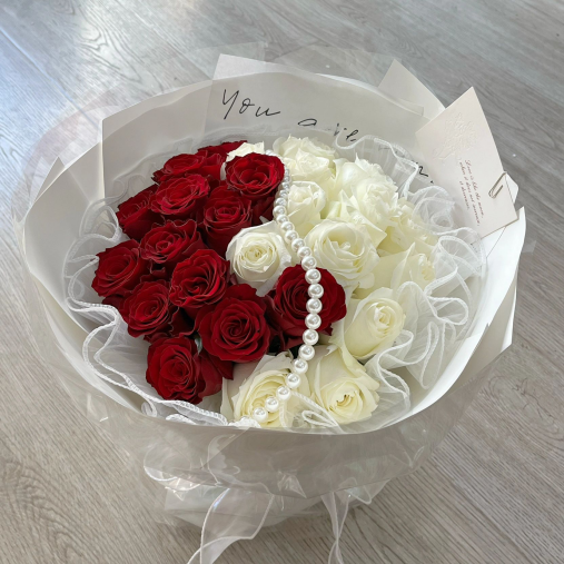 F007【白月光与朱砂痣】33支红玫瑰白玫瑰混搭鲜花花束【White Moonlight & Scarlet Love】 – 33 Mixed Red and White Roses Bouquet**