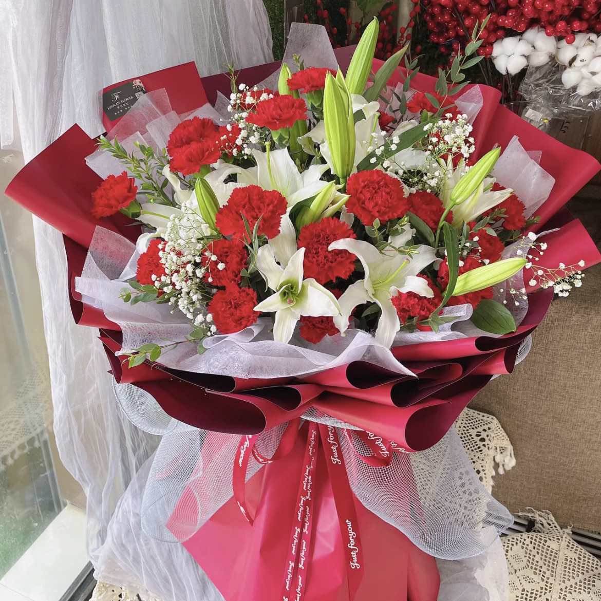 F128 红色康乃馨百合满天星花束Red carnation, lily and gypsophila bouquetx