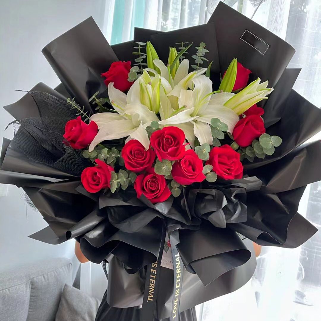F122 红玫瑰百合花束Bouquet of red roses and lilies