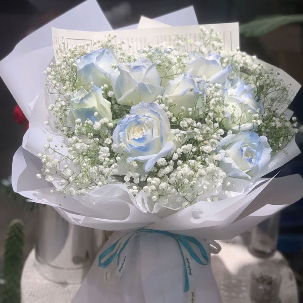 F115 9支喷色蓝玫瑰加满天星花束9 spray blue roses and baby’s breath bouquet