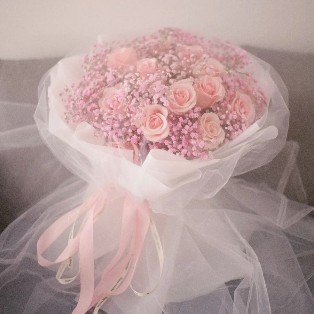 F114 网纱粉玫瑰和满天星花束Mesh pink rose and baby’s breath bouquet